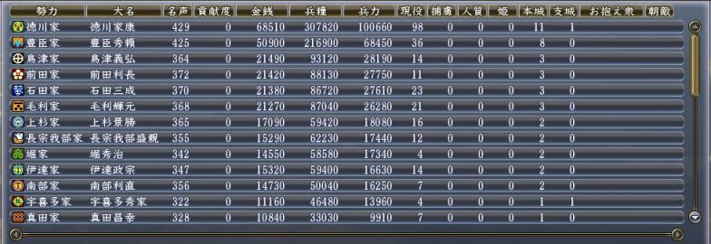 同盟:石田、相馬、佐竹、上杉、福島、真田、織田、宇喜多、毛利、長宗我部、小早川、大友、立花、小西、有馬、加藤(清正)、島津