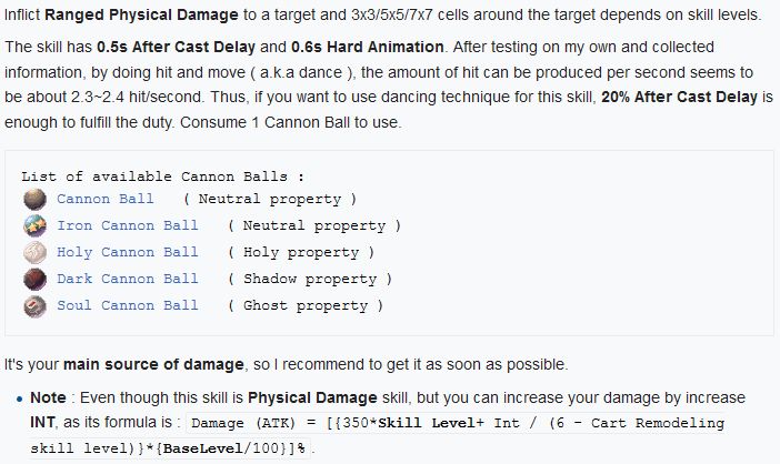 上に記載されるとおり、カートキャノンには3秒とかなり長い変動詠唱がある。一方、0.5秒のディレイがあるが、これとほぼ同じ秒数のスキルモーションが伴うことから、ディレイの短縮はカートキャノンの連打速度にはほとんど影響しない。また、いわゆるクールタイム、スキル特有の再使用インターバルはゼロである。以上から、カートキャノンの運用では、変動詠唱の短縮、理想的には無詠唱が、要求される。これまでに提案されたところでは、その方策として、詠唱パーセントカットを有する装備やカードを採用するタイプと、ステータスによる詠唱短縮を図るタイプ、二つがある。
