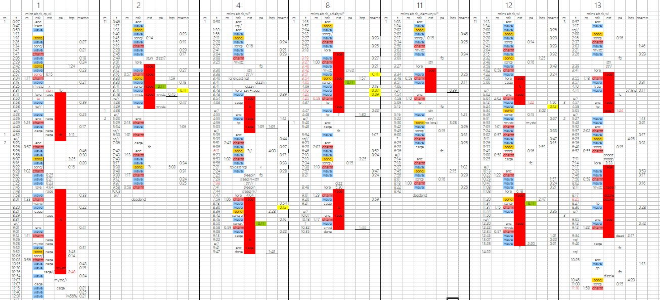 上記リプレイファイルより読み取ったタイムコースを下図に示した。縦軸が時間経過を示し、上方向がゼロ秒である。使用されたスキルの種類については、青色でファンタズマルウェーブ、ピンク色でチャーミングアルアー、オレンジ色でセイレーンズソングをマーキングした。これらのスキル列と並行し塗られた赤色は、ナイソーリがレイジ状態にあったことを示している。