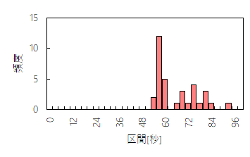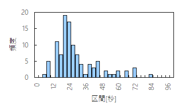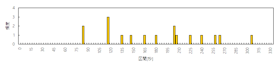 同様に、頻度分布を示した(下図)。21~27secに分布のピークを認めるが、それより短いインターバルが多数記録された。これはクールダウンタイム以外の要因による制御を示唆する。そこで、際立って短いインターバル(7~12sec)を記録したウェーブを概観図中で黄色にマーキングしたところ、いずれもレイジ状態での記録値であった。ナイソーリがレイジ状態にあるとき、ウェーブの再使用インターバルが短縮する可能性が提示された。