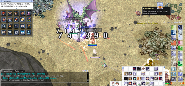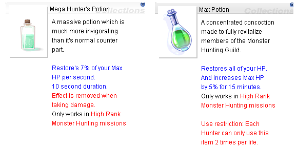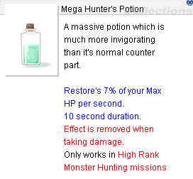 メガハンターポーションはサブの回復アイテムとして、緊急性が低い場面でのヒットポイント回復に有用である。これは使用(詠唱があり、詠唱中に移動、スキル使用すると使用がキャンセルされるので注意)後、ヒットポイントを漸進回復する回復アイテムである。回復中は移動やスキルの使用は可能だが、ダメージ(ガロナスのスタック毒によるヒットポイント消耗を含む)により効果がキャンセルされる。