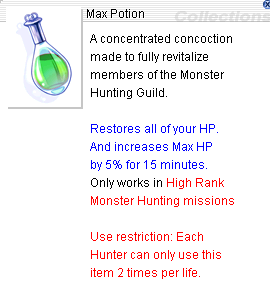 マックスポーション(上図右)はヒットポイント回復アイテムとして主要なものである。これは、使用することで即座にヒットポイントを全快する。ただし使用回数に制限があり、2回である(このカウントは死亡の都度リセットされる)。