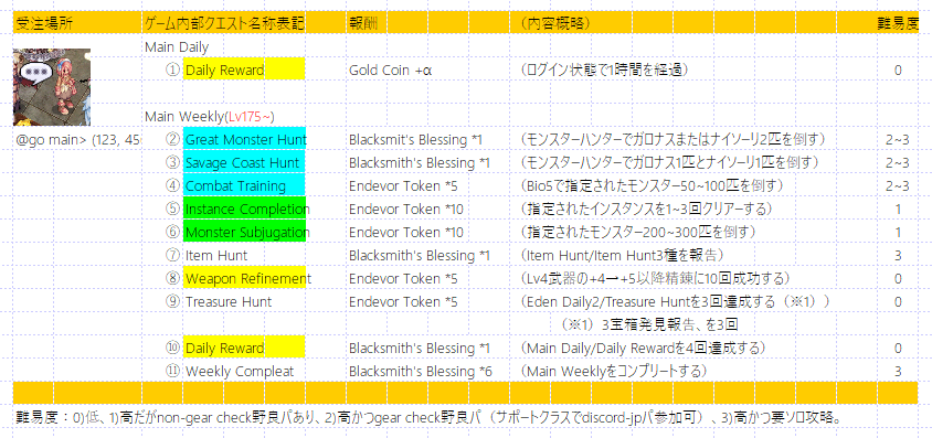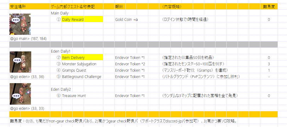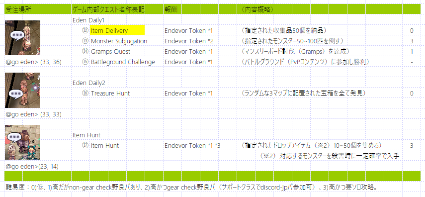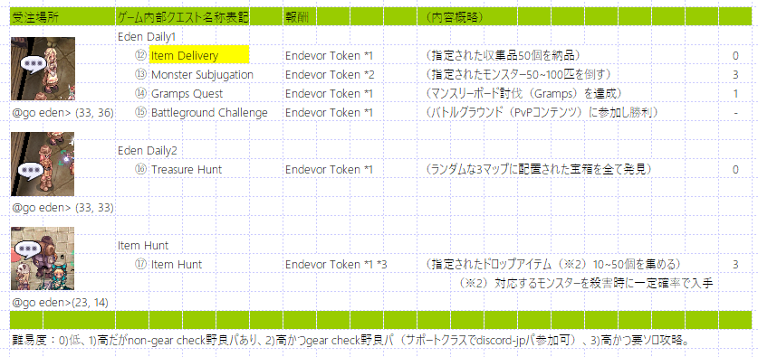 エデン。ベイリー(②)は「エデン・デイリー」として、1)モンサブ、2)アイテムデリバリ、3)バトルグラウンド、4)グランプス、を発行する。1と3はデイリーとするには労力大。4は受注の必要なし。③はウィークリーのトレハン、④はウィークリーのアイテムハント。