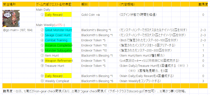 要求:Lv175。8種類の課題をコンプリートし、「鍛冶屋の祝福(精錬失敗をチャラ)」をゲットしよう、という趣旨のクエストである。これを達成可能とすることは、ゲーム進度をステップアップするうえでの近道であった(過去形)。