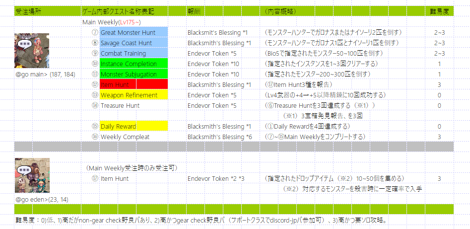 今現在は、1)所要時間の増加と2)鍛冶屋の祝福の価格低下、により、相対的にウィークリーの重要度は低下している。コンプリートに拘らず、個別課題のうち報酬が労力に見合うものを選んで取り組むと良いであろう。