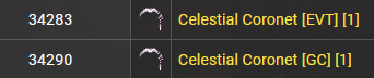 ゴールドコインと引き換えたアイテムには「GC」(または無銘、ショップポイントでも購入可能なアイテムの場合)と付き、アカウント間のトレードや露店での売買が可能なことを示す。対して、「EVT」と記載があるアイテムはトレード・売買不可で、これらはエンデバートークンとの引き換えや、季節イベントの景品として与えられたアイテムであることを示す。