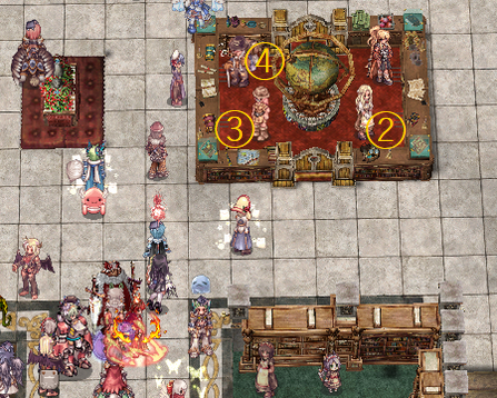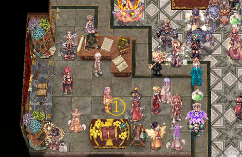 いわゆるログインボーナス。ログインより1時間経過(30分と1時間経過時に水色のログがチャット欄に流れる)し、メインオフィス(@go main)の「ヴァレリー(下画像の①)」と会話するだけでゴールデンコインとオマケを貰える。