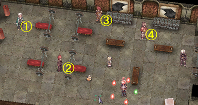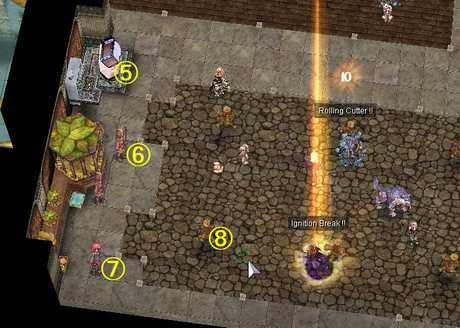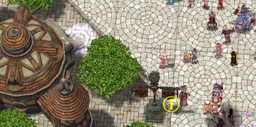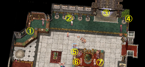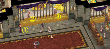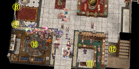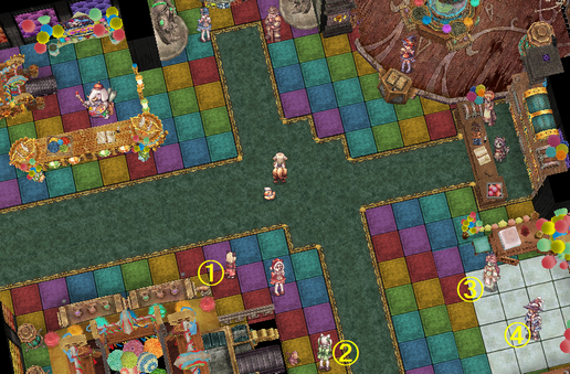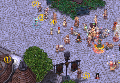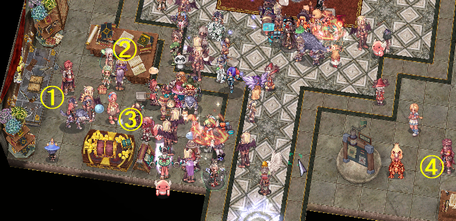 プロンテラ中央の噴水(右上)とメインオフィスエントランス(左下、①)。シーズナルイベントやミニゲームなど催しごとの会場ともなることも。
