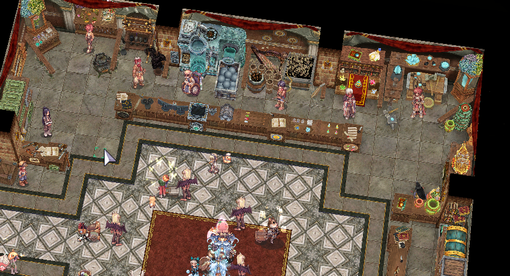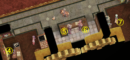 広間上のカウンターには、スキルの使用に必要な触媒アイテムなどを販売するノンプレイヤーキャラクターが配置されている。