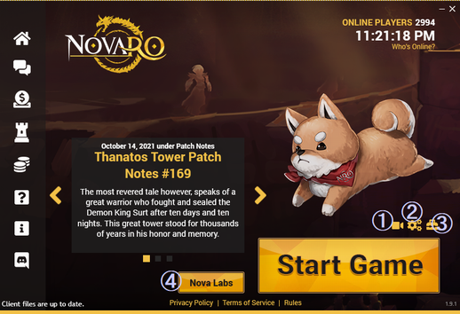 ランチャー画面。カメラアイコン(①)はリプレイ、「NovaLabs」(④)は未実装コンテンツをテストするためのミラーサーバー。また、余白部分を右クリックすることでパッチオプションを開く。アップデートにともない不具合を生じた場合などに、最近のパッチを当てなおす、といった対応が可能である。