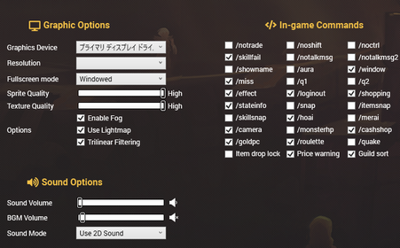 チャット欄にコマンド打ち込みで、「/aura」(キャラクターのLv200オーラ表示・非表示)、「/quake」(スキルによる画面揺れ有効・無効)、「/monsterhp」(モンスターのヒットポイント表示・非表示)などを設定する。
