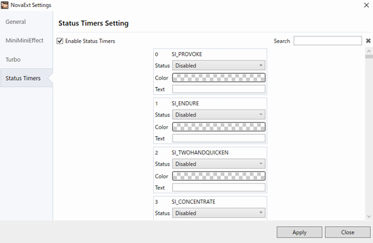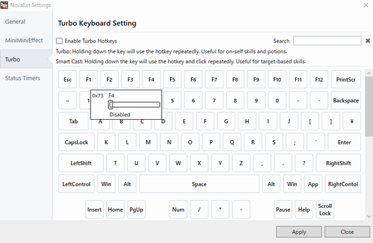 有効化するには、ターボホットキーをオンにし、連打するキーを指定する。このときモード1(スライダー中央)とモード2(右端)を調整する。ゲーム内でターボが機能しない場合は、「NovaExt Settings>General>Turbo Setup」を変更すると改善することもある。