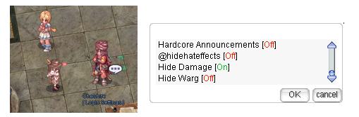 「/aura」をオフでオーラエフェクト(Lv200とかのやつ)を非表示にする。「/quake」をオフでメテオストームやアースストレインの画面揺れエフェクトが無効化される。