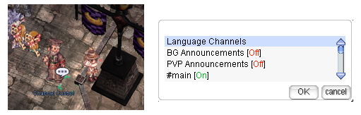 プロンテラ噴水(@go 0)より左下「チャンネルセッティング」から、「#main」、「#support」、「#LFG」以外をオフに。