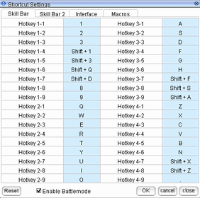 バトルモード:デフォルトではスキルショートカットはファンクションキーに割り当てられるが、バトルモードを使用(/bm)すると文字キーへと拡張される。使用するスキルの種類が多いクラスには必須のモードであるが、チャットに不便を生じるという弊害がある。