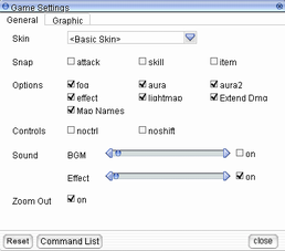 オートルートや横殴り防止、エフェクト簡易表示などのデフォルト状態を指定できる。ここでのセッティングは、プレイヤーコマンドによってオンオフ状態が変化するが、ログアウトログインしたときデフォルト状態に復帰する(ログインセッティングに項目がないオプションについてはコマンドによる変更が持続するものも)。