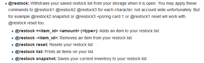消耗品と収集品は、補給された状態で「@restock snapshot」でリスト登録する。装備品をリストックリストに含めるにはアイテム個別に登録する必要がある。使用例(追記)。