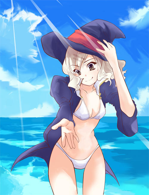水着かつ魔女の格好の左木さんが「とりっくおあとりーと」と是空さんに手を出しているところです。