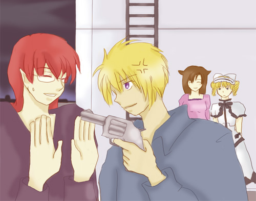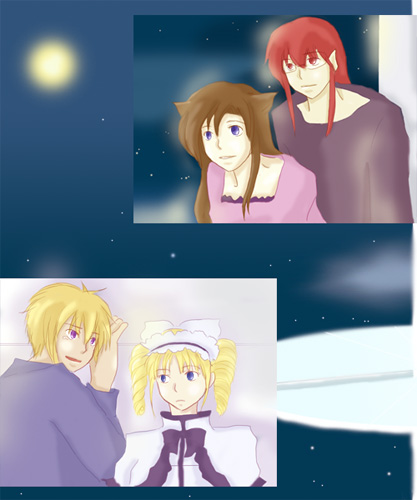 お月見のシーンと、リクエストにあった”劉輝さんに銃を突きつけられているところ”で描かせていただきました。