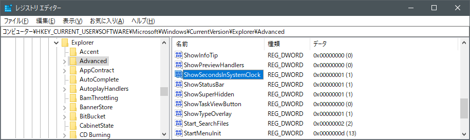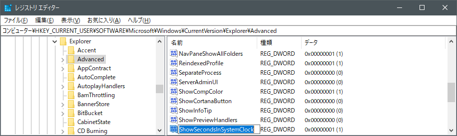 Windows Registry Editor Version 5.00 [HKEY_CURRENT_USER\SOFTWARE\Microsoft\Windows\CurrentVersion\Explorer\Advanced] "ShowSecondsInSystemClock"=dword:00000001
