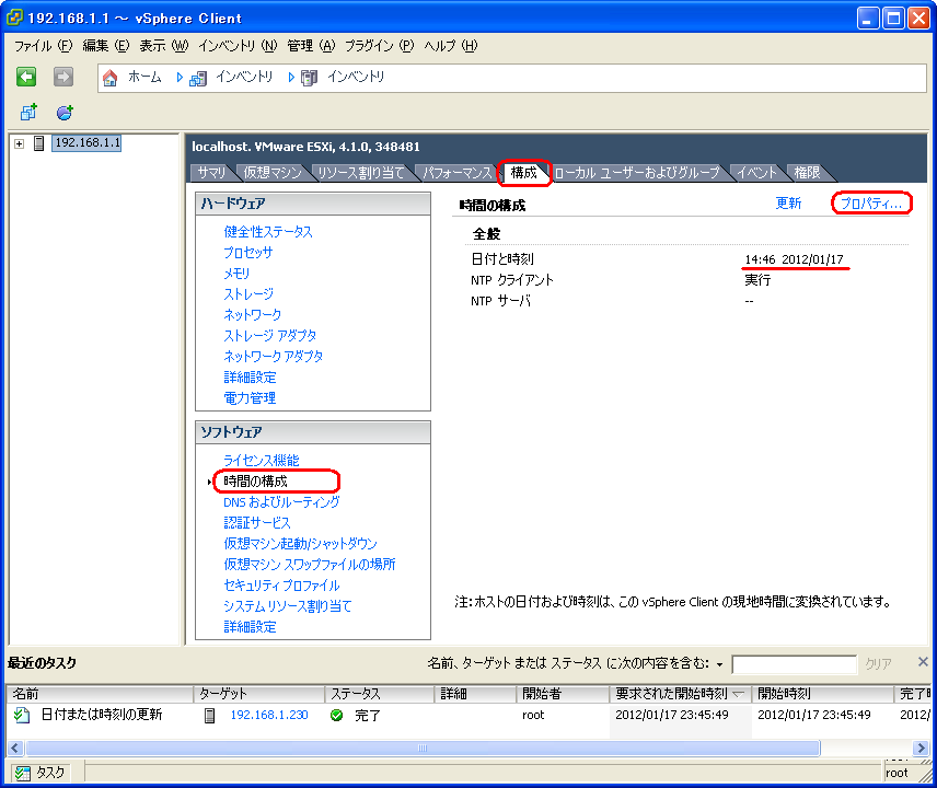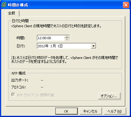 ②『vSphere Client』から実時間を設定。※BIOSには設定した時間-9時間が設定される。