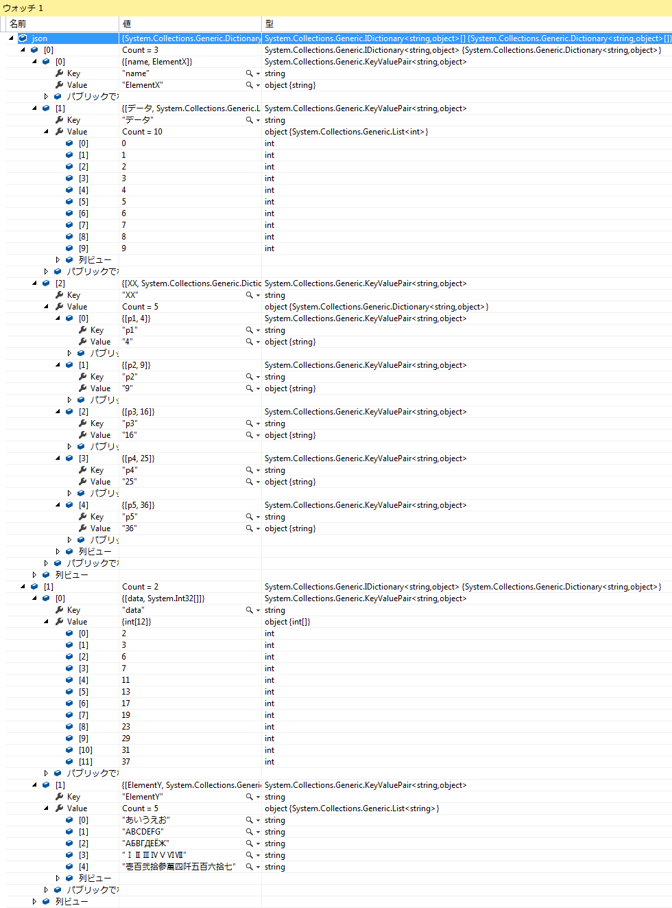なので、こんな風に適当にDictionary、List、Arrayを組み合わせてobjectを作っても...