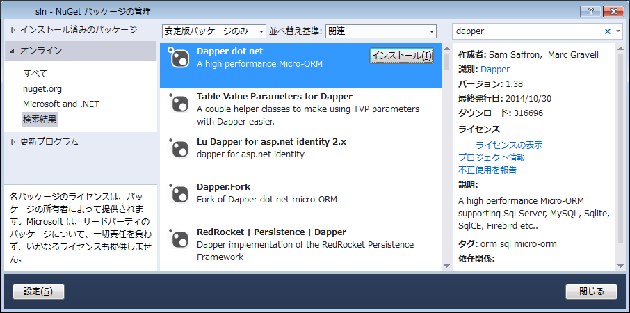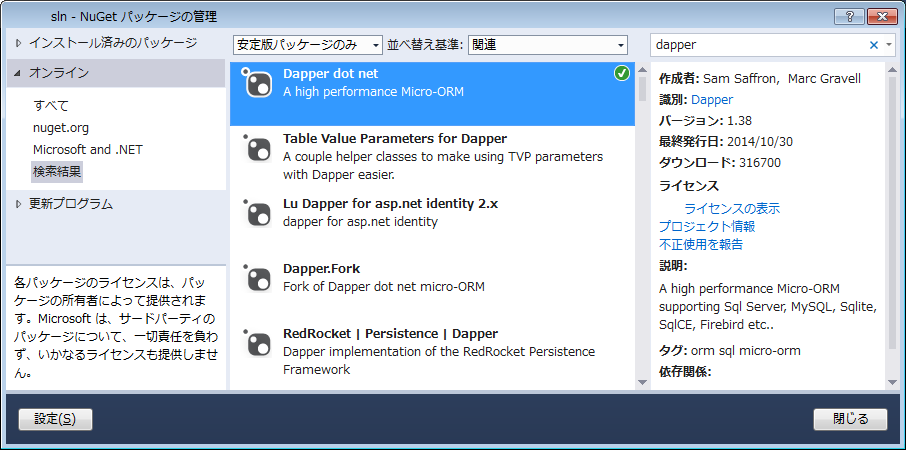 以下の画面が表示されるので、右上の検索欄に『dapper』と入力する。しばらくすると検索結果が表示される。