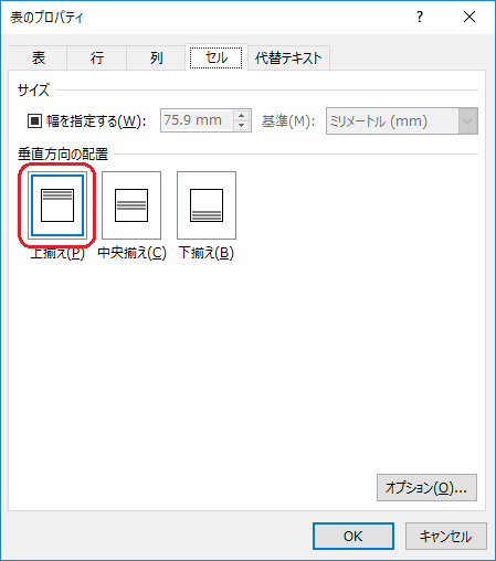 表のプロパティダイアログで、セルタブを選択。