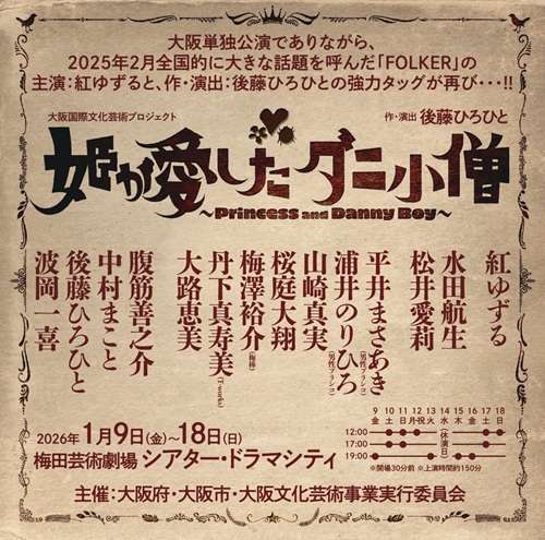 舞台 『姫が愛したダニ小僧〜Princess and Danny Boy〜』 TAP 出演情報 大阪国際文化芸術プロジェクト @梅田芸術劇場 シアター・ドラマシティ 主演:紅ゆずる 作・演出:後藤ひろひと 出演:水田航生 松井愛莉 平井まさあき(男性ブランコ) 浦井のりひろ(男性ブランコ) 山崎真実 桜庭大翔 梅澤裕介(梅棒) 丹下真寿美(T-works) 大路恵美 腹筋善之介 中村まこと 後藤ひろひと 波岡一喜 公演時間:約150分、料金:7,000円 (前売当日共・税込・全席指定) 先行販売:2025年9月20日(土)11:00~9月22日(月)11:00 一般発売:2025年9月27日(土)10:00~ 大路さんは 2005年の公演に続き、みゆき役で登場。 もう一つの役名がベアトリーチェなのかは現在不明です。 各公式SNSは、公式サイトを参照。 参考資料 2005年公演 制作発表 大路恵美さんのブログ 「『姫が愛したダニ小僧』」 同インスタ 「『アンニュイ』」 同インスタ 、 「『本日』」 同インスタ 「姫が愛したダニ小僧」 同インスタ ![]() ![]() ![]() ![]() ![]() |