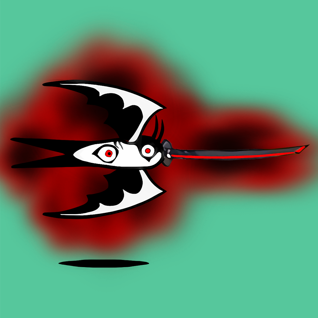 元々は体の中心ラインを刀に置き換えてデザインしたけど、しっくり来なかったのでボツにして口に咥える感じにしたら、