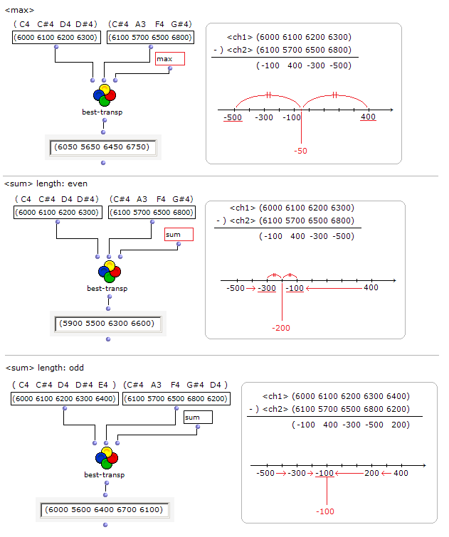 - max: それぞれ第n音同士で<ch1> - <ch2>と引き算する。そのうち最大のものと最小のものの相加平均を出し、そのぶんだけ<ch2>を移高する。