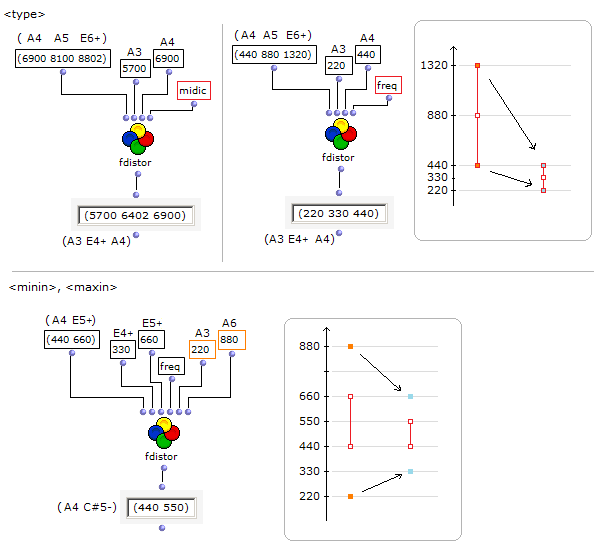 <chord>の最低音が<minout>に、最高音が<maxout>になるように<chord>の周波数を歪ませる。