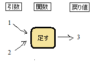 関数は引数(ひきすう)をもらって処理してデータを返す。