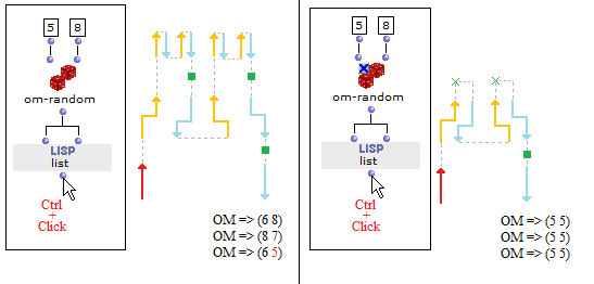 - om-randomは計算を行わず最後に出した値を思い出す。この例ではom-randomは通常モードで最後に出した5をlistに返す。
