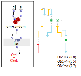 - listは入力された要素をリスト化する関数。そのための材料を集める。listは第1入力を確認、om-randomに「値くれ」と言う。