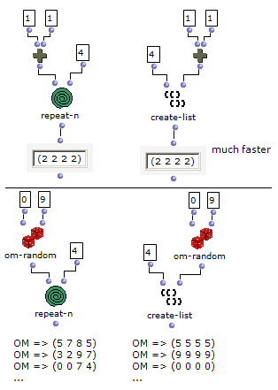 下図の最初の例はプログラムとしては冴えない。なぜなら、repeat-nが拾ってくる値は必ず2であるにもかかわらずom+関数に4回いちいち計算させているため。