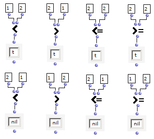 num1 ≧ num2 ならt。num1 < num2 ならnil。