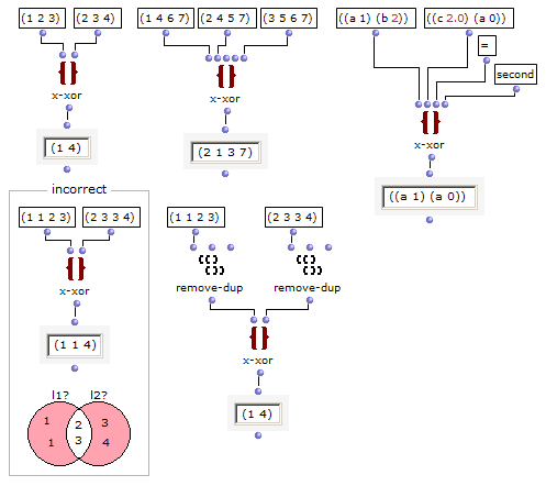 この関数はその動作をLispのビルトイン関数 set-exclusive-or に拠っている。http://www.lispworks.com/documentation/HyperSpec/Body/f_set_ex.htm