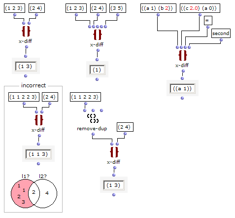 この関数はその動作をLispのビルトイン関数 set-difference に拠っている。http://www.lispworks.com/documentation/HyperSpec/Body/f_set_di.htm