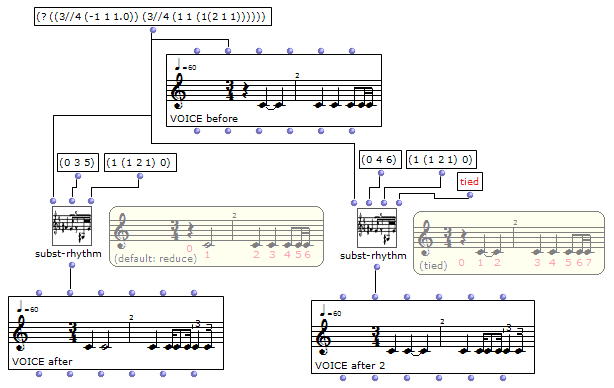 <elem>の要素が整数ならその音価で置換、リストならその比で分割される。