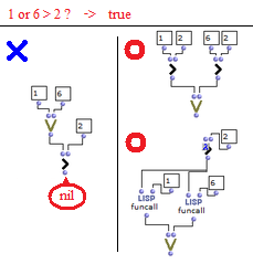 例えば「『1か6のどちらかが2より大きい』は正しいかどうか。(正しい。)」というプログラムを考える。これを文字通りに組んでしまうと下図の左になる。がこれはtrueにならない。