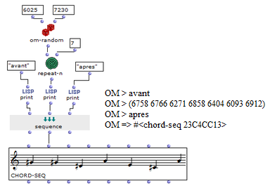 Repeat-n関数が15回om-random関数を呼ぶ。om-random関数はその度に6075から7230からランダムに値を選ぶ。15コ集まったらrepeat-n関数はそのリストをchord-seqファクトリーボックスに渡す。