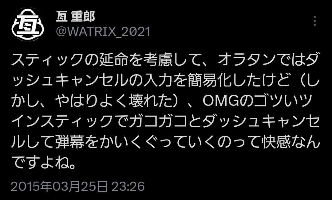 スティックの延命を考慮して、オラタンではダッシュキャンセルの入力を簡易化したけど(しかし、やはりよく壊れた)、OMGのゴツいツインスティックでガコガコとダッシュキャンセルして弾幕をかいくぐっていくのって快感なんですよね。