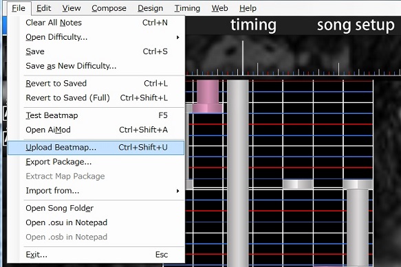 画面上部のメニューバーからFile->Upload Beatmap...(Ctrl+Shift+Uで同様の操作)でアップロード画面へ遷移する。