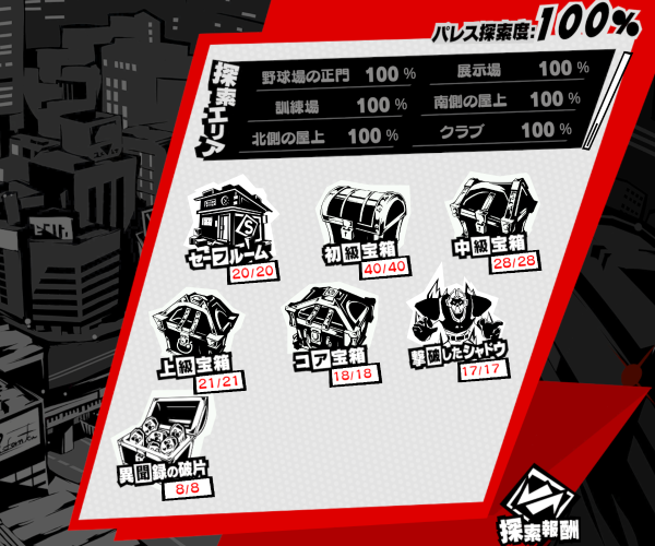 以上の方法でパレス探索度を上げ、探索度が一定レベルに達すると報酬を獲得できる。