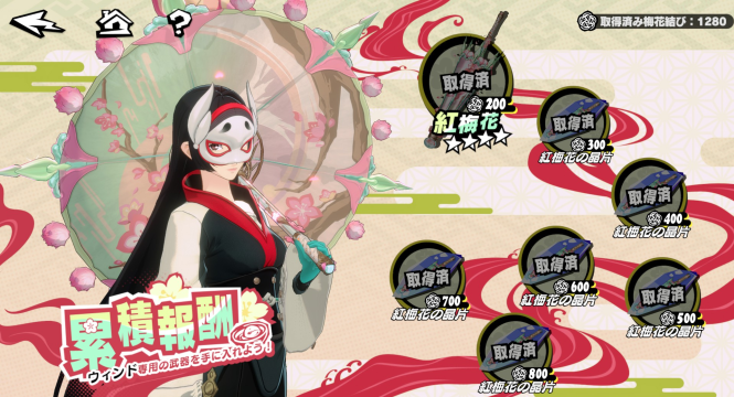 「梅花結び」を集めると「多祢村 理子」専用★4武器「紅梅花」および武器を最大まで改造できる素材が獲得可能。