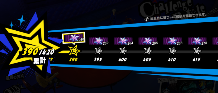 試練が進むほどシャドウ側のレベルが上がり、15辺りからは各パレスの強敵戦相当、20にもなればこちらの怪盗達のレベルが70前後でも☆4怪盗なら当たり前のように倒されるほど強さがインフレするので強化だけでなく戦略を立ててないと星の獲得以前に敗北を繰り返すだけになる。