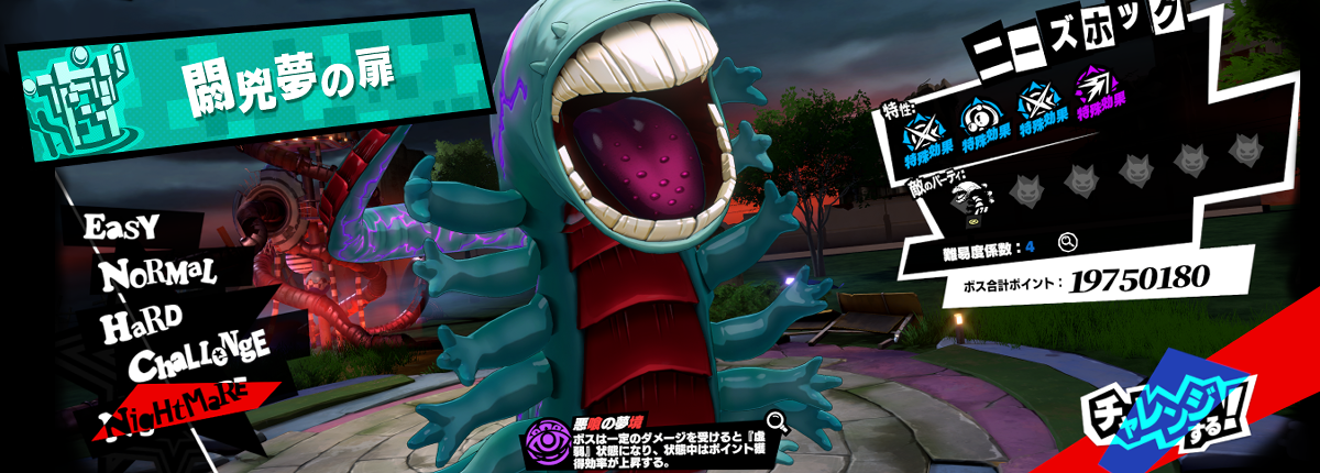 - EASY(敵Lv.38)・NORMAL(敵Lv.48)・HARD(敵Lv.58)・CHALLENGE(敵Lv.68)・NIGHTMARE(敵Lv.78)