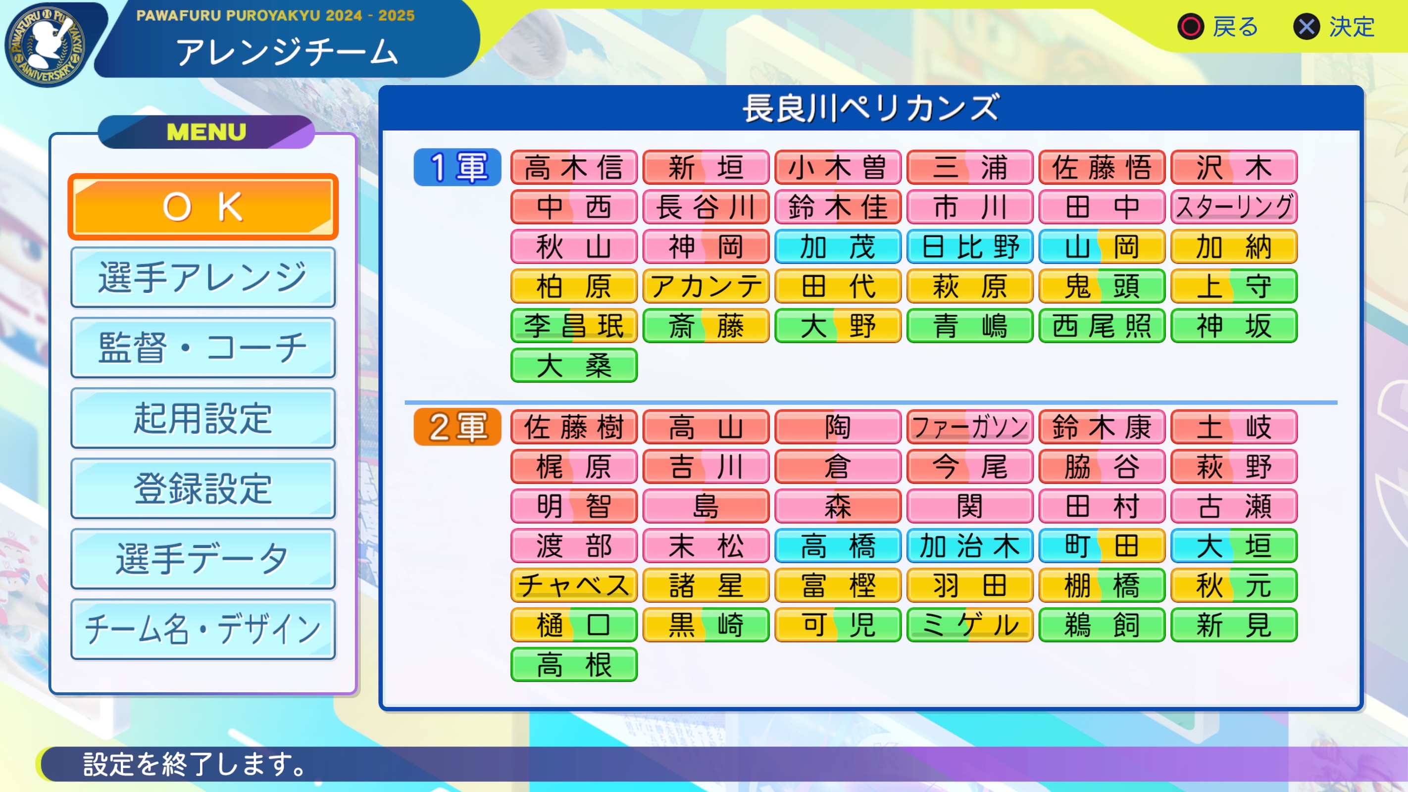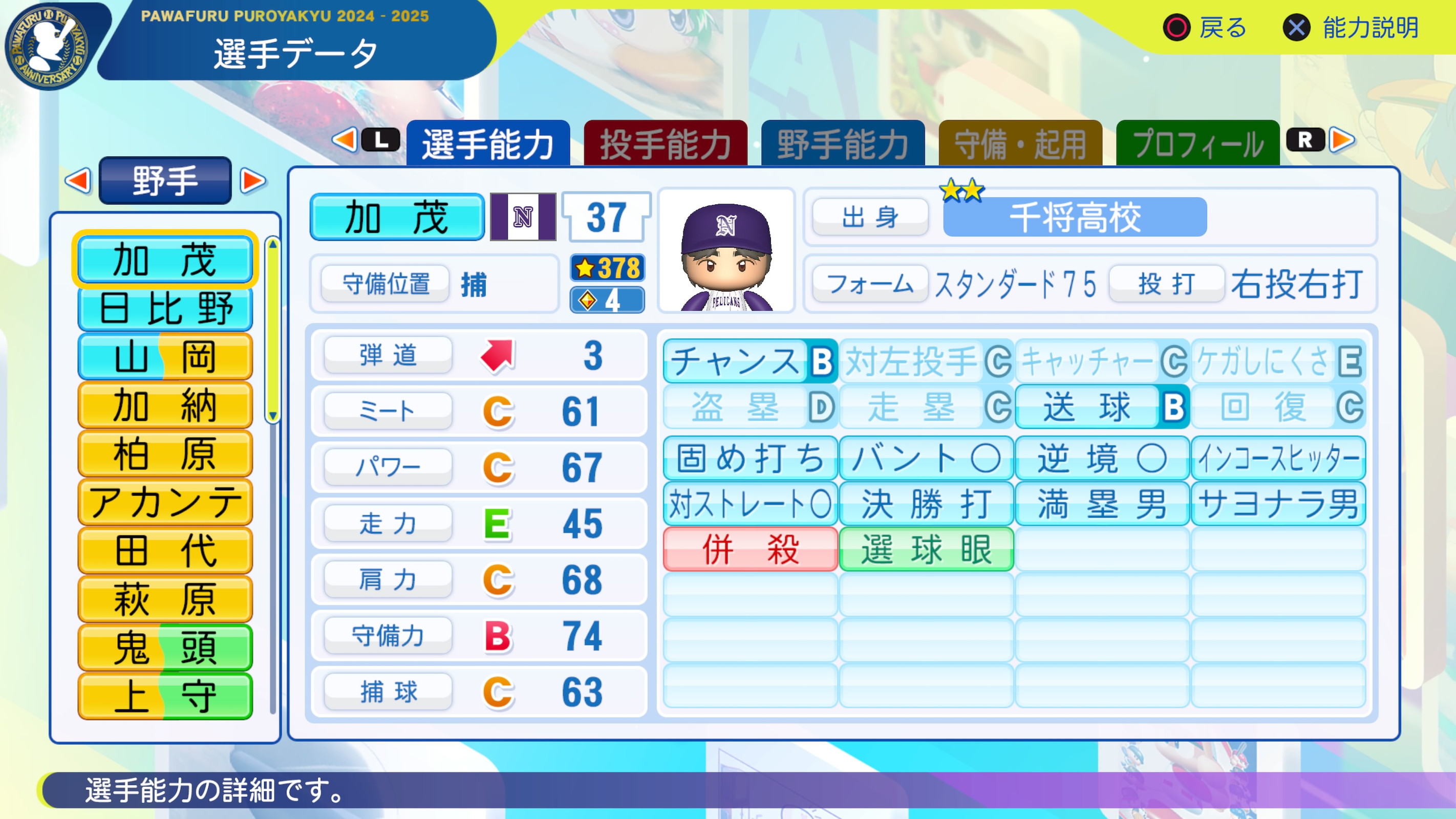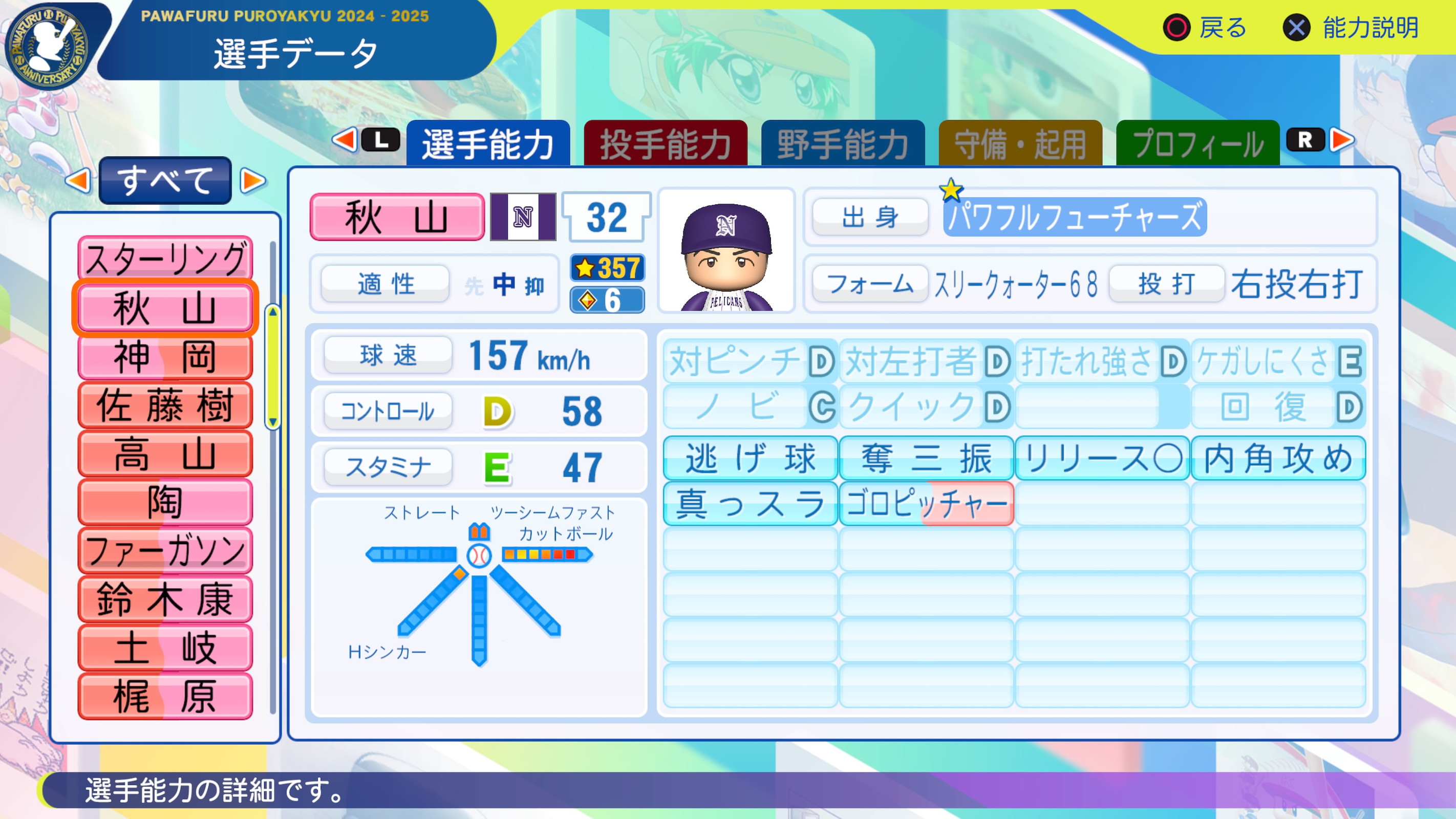 選手成績は2024年度のものです。しかし選手の能力自体は、2025年度開幕~5月のものを想定した調整をしているため、必ずしも成績と成績がリンクしているとは限りません。