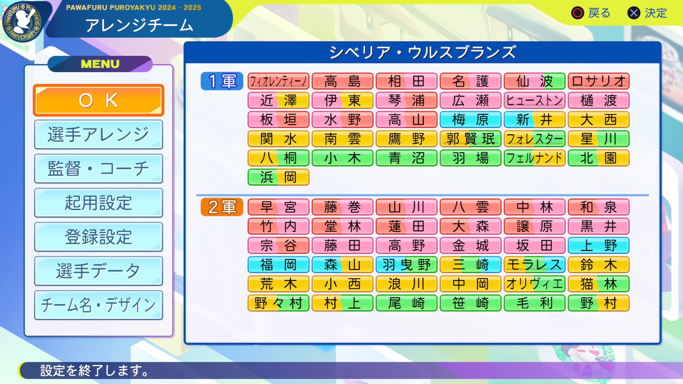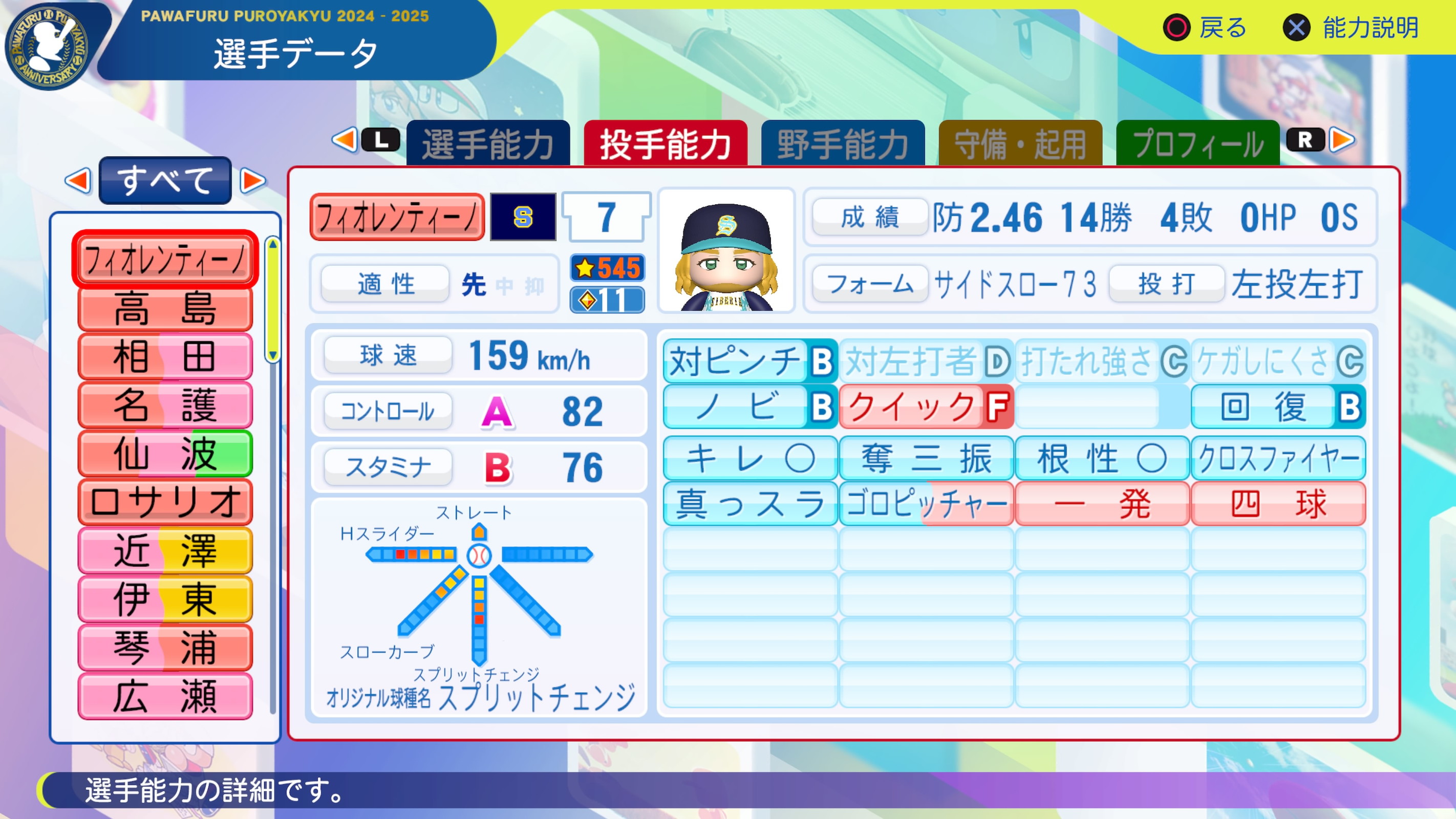 投打共に柱となる選手がいるので上位争いができるくらいの強さです。イチオシは抑えの2人です。抑えは近澤と伊東のWストッパー体制です。どちらもファースト適性があるので試合終盤は打者によって入れ替わりながら投げることができます。